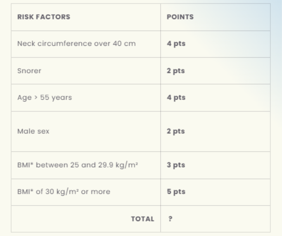 Each risk factor for the syndrome corresponds to a certain number of points. Refer to the table opposite and add up the points that apply to your risk factors. A score of 8 points or more suggests the presence of sleep apnea. If you score 8 points or more, talk to your doctor.