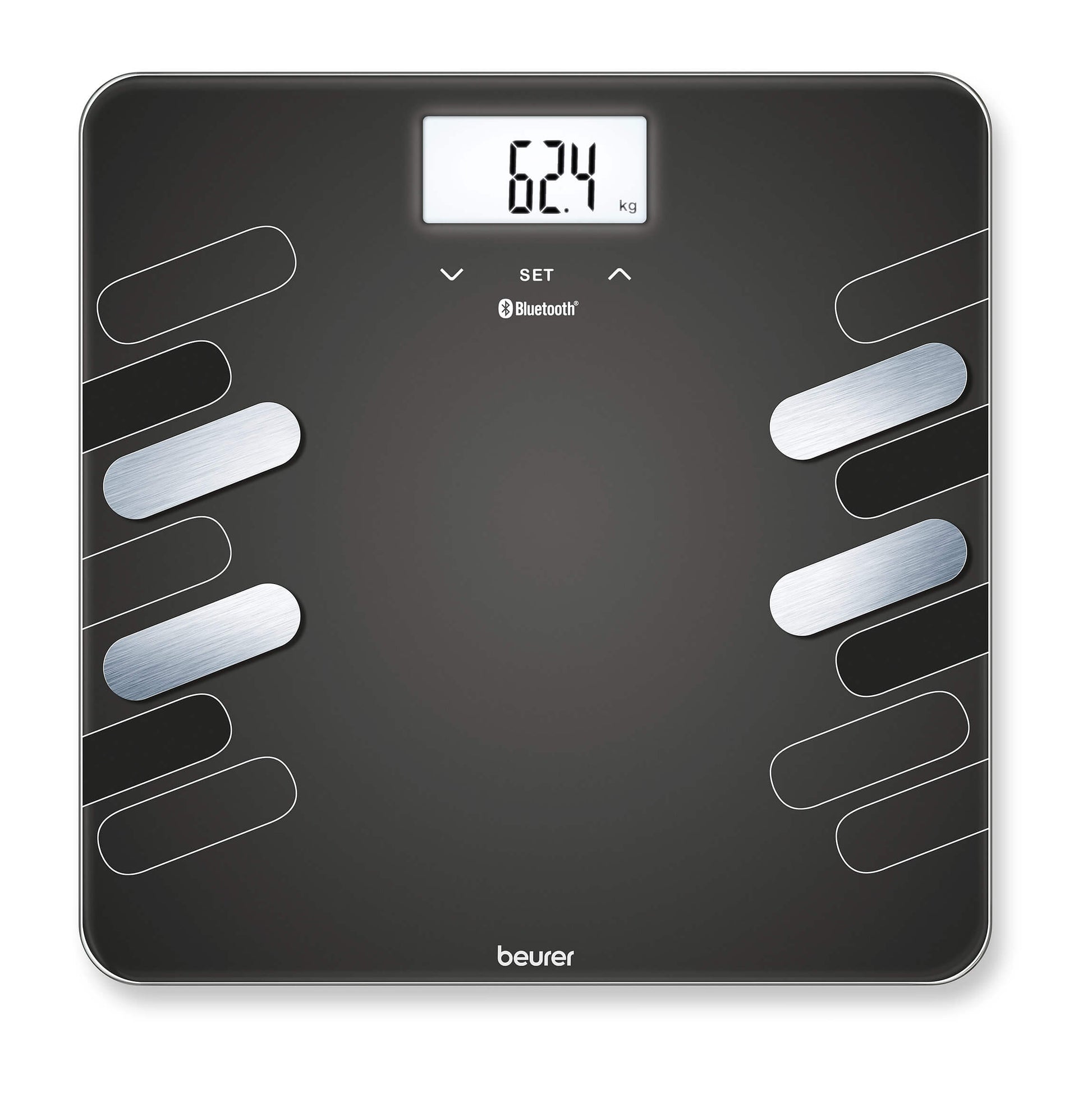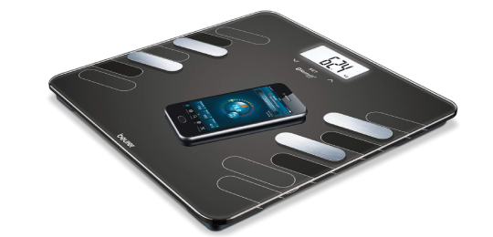 This connected impedance meter provides you with a complete evaluation of your body values: body mass, fat, water, muscle and bone mass, AMR/BMR calorie display and BMI.